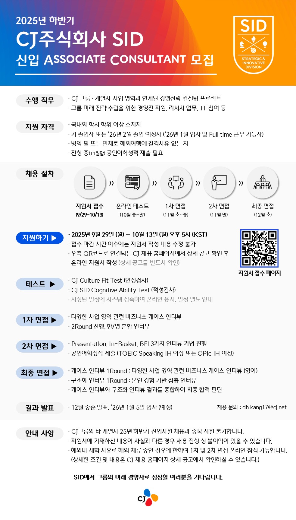 Opportunities 기업 채용 공고는 corporate@illinoisksa.org로 보내주시면 감사하겠습니다. [CJ주식회사 SID] Associate Consultant(신입) 모집 작성자 KSA 기업팀 작성일 2025-09-29 17:23 조회 586 25년 하반기 CJ주식회사 SID 신입 Associate Consultant 모집 전형이 시작되어 소식 안내드립니다. ■ 25년 하반기 CJ SID 신입 모집공고 바로가기 ☞ Click ■ CJ주식회사 SID 홈페이지 둘러보기 ☞ cjsid.com 한국에서의 커리어와, 전략기획 직무에 관심 있는 분들께 좋은 기회가 될 수 있기를 바랍니다. 감사합니다. 좋아요 0 싫어요 0 인쇄 « 한화시스템/ICT 2025년 하반기 신입사원 채용 공고 [현대자동차] 현대자동차 10월 신입 채용 » 목록보기 Powered by KBoard