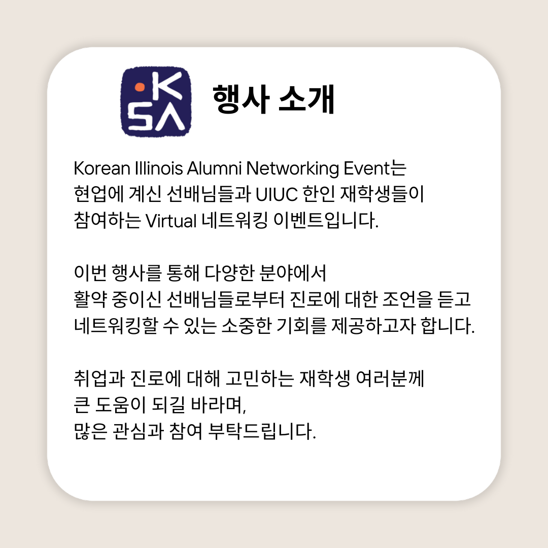 2월 27일 금요일, 현업에서 활동중인 UIUC 한인 선배님들과 직접 이야기 나눌수 있는 온라인 네트워킹 이벤트가 열립니다!
