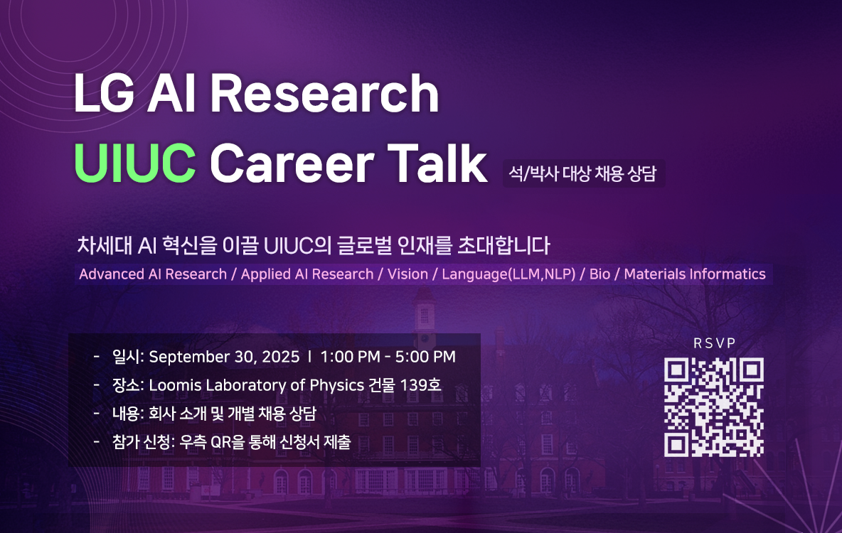 LG AI Research에서 UIUC 석박사 대상 1on1 채용 상담 <CAREER TALK>를 진행합니다.